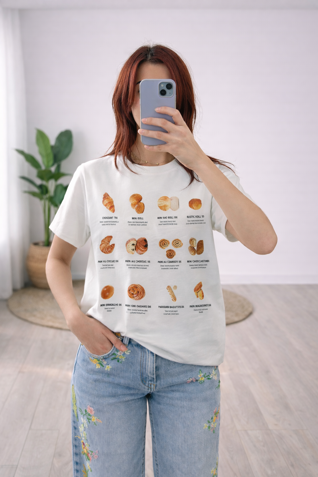 La grafica raffigura croissant dolci e salati, creando un design creativo e appetitoso che richiama l’atmosfera dei café e delle colazioni lente. Facile da abbinare a jeans, pantaloni casual o gonne, questa T-shirt è perfetta per il tempo libero, brunch, weekend o per aggiungere un dettaglio food-inspired al tuo look quotidiano.