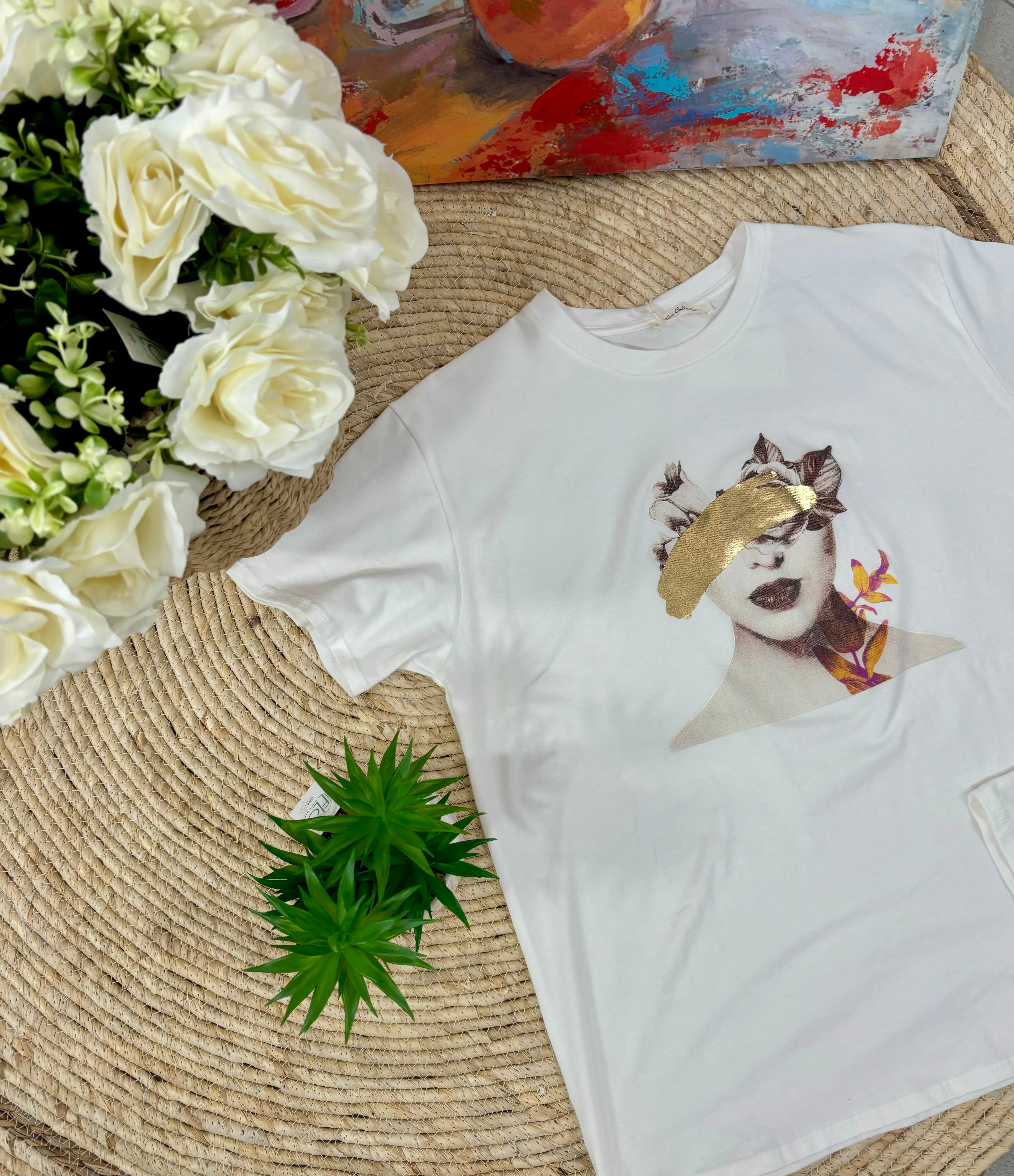 La grafica raffigura una donna bendata decorata con dettagli dorati e fiori colorati, creando un design contemporaneo e raffinato che dona carattere a qualsiasi outfit. Facile da abbinare a jeans, pantaloni casual o gonne, questa T-shirt è ideale sia per il tempo libero che per look streetwear chic e creativi.