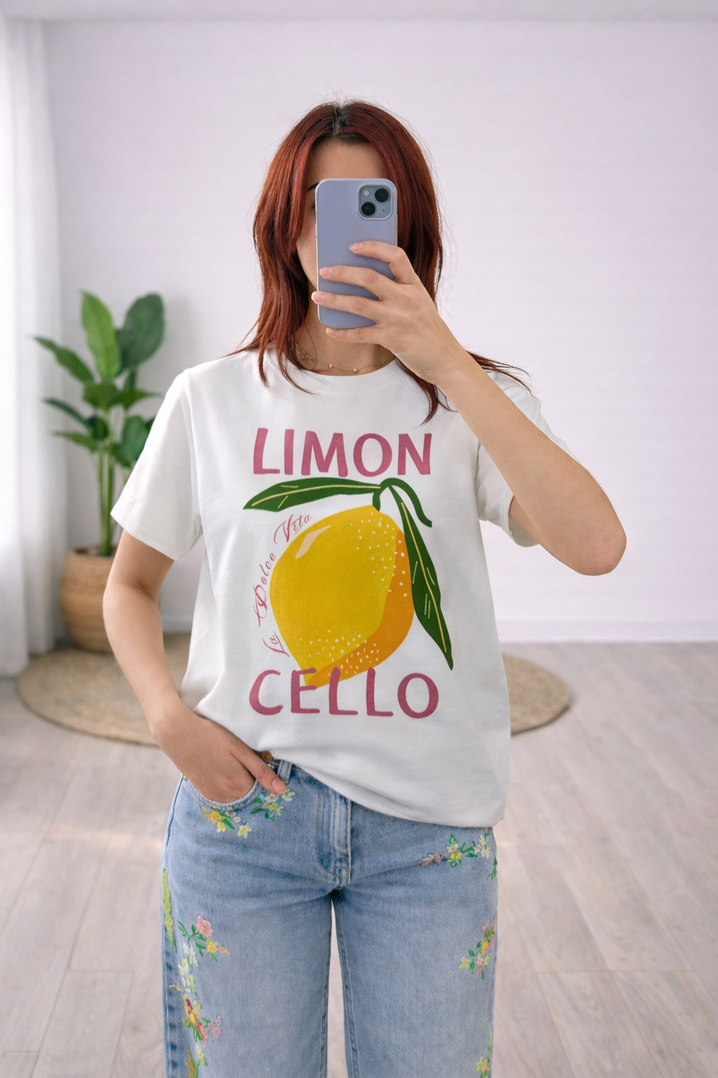 La grafica raffigura un limone accompagnato dalla scritta “Limoncello” in rosa, creando un design vivace e femminile che richiama l’atmosfera delle vacanze italiane. Facile da abbinare a jeans, pantaloni chiari o gonne, questa T-shirt è perfetta per il tempo libero, le vacanze o per aggiungere un tocco pop e spensierato al tuo look.
